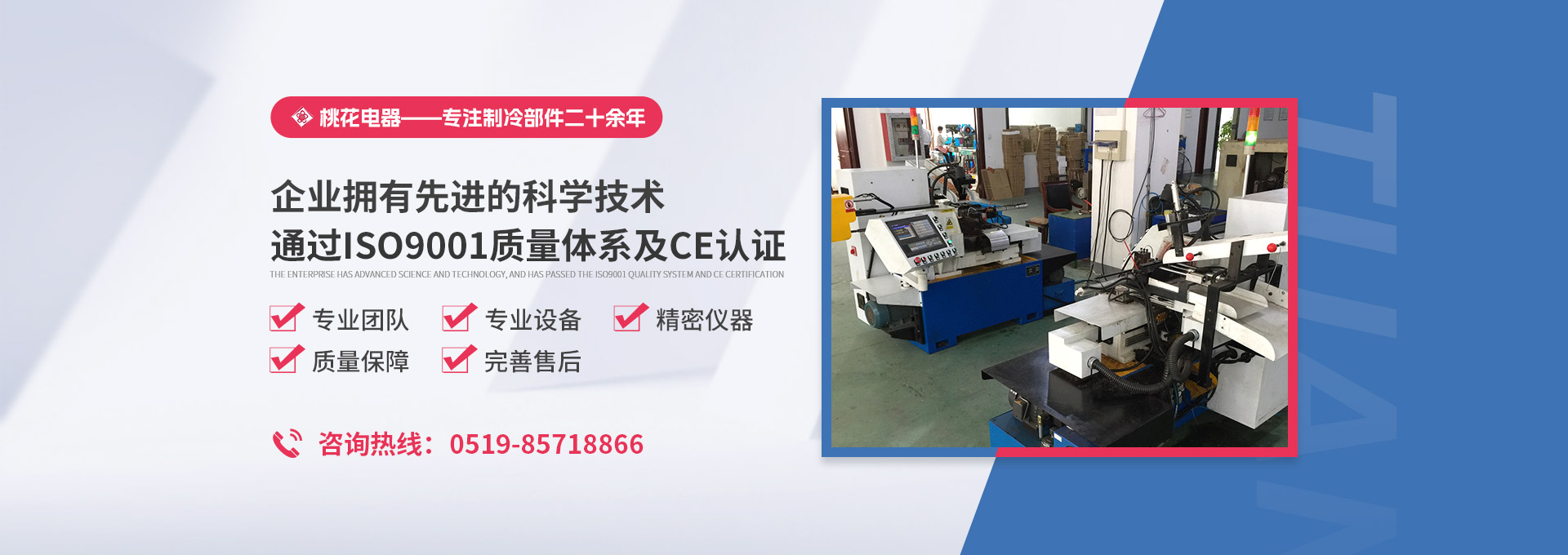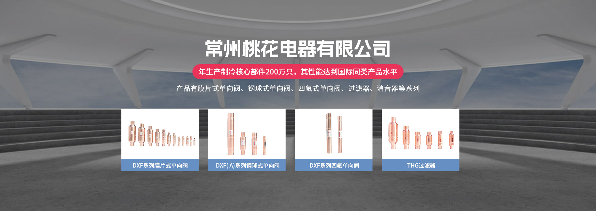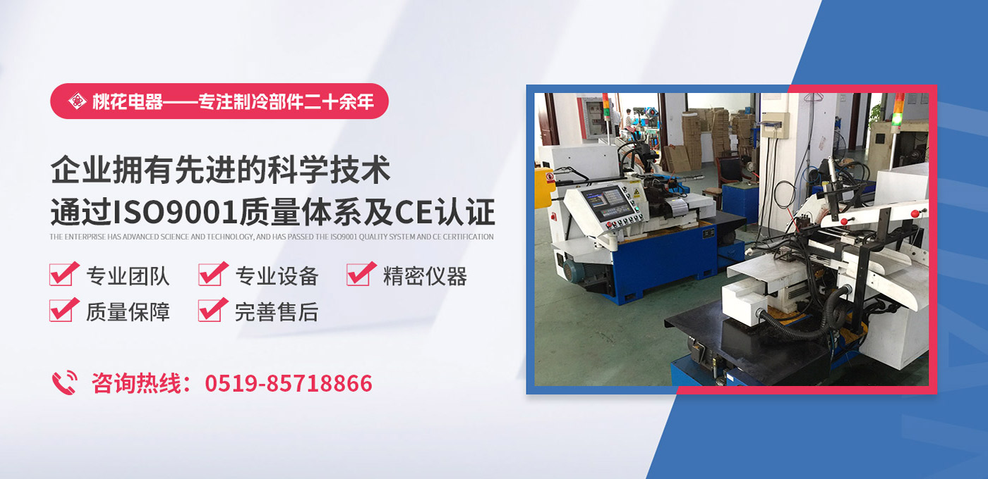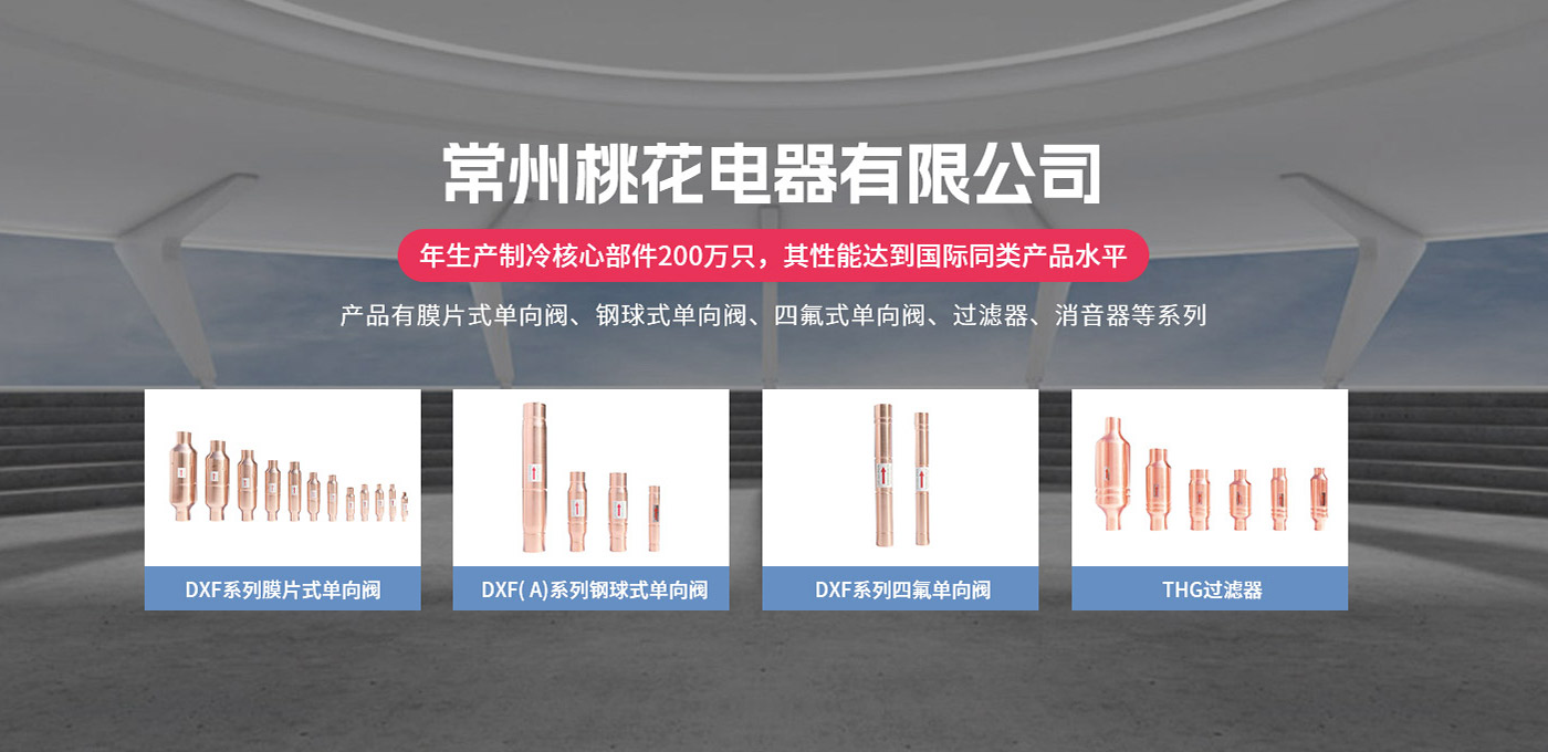 常州桃花電器有限公司地處中國長江“金三角”之稱的上海至南京高速公路、城際高鐵、常州高新經濟技術開發區路段,交通便利、技術力量十分雄厚。它是集研究、開發設計、制造和經營制冷核心部件的企業,主要生產中央空調上使用的制冷部件。產品有膜片式單向閥、鋼球式單向閥、四氟式單向閥、過濾器、消音器等系列。年生產制冷核心部件200萬只,其性能達到國際同類產品水平?! ∑髽I擁有先進的科學技術、國際先進的生產加工設備和精密的檢測儀器,并已通過ISO9001質量體系及CE認證,公司歷史悠久,2000年起,經過長期積累、沉淀,經驗豐富,從而保證了產品的高質量、高性能、高耐用性。企業產品在國內外市場具有較高的知名度,深受眾多中外品牌制冷客商的好評。主要客戶有約克、麥克維爾、美的、開利、特靈、頓漢布什、清華同方、天加等.并出口北美、歐洲、東南亞等地區。  高品質產品是企業的保證,周到服務是合作友誼的承諾,企業本著“求